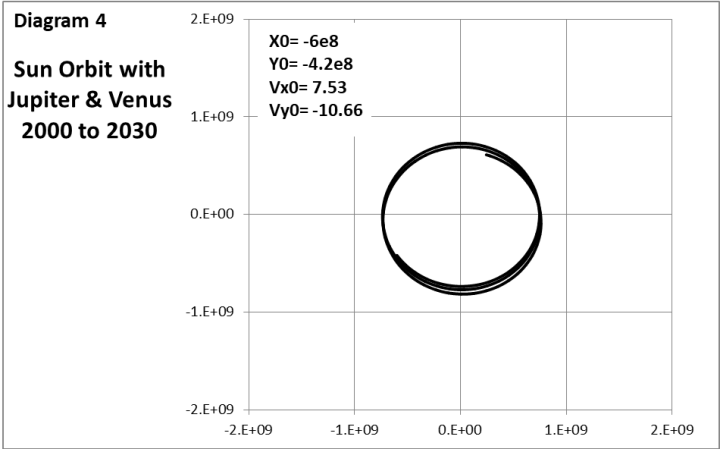 Obwohl Jupiter 390 Mal massereicher ist als Venus, befindet sich Venus in einer Entfernung von 1/7 zur Sonne, sodass Venus einen nachweisbaren Einfluss auf die Bewegung der Sonne hat, wie in Diagramm 4 dargestellt.