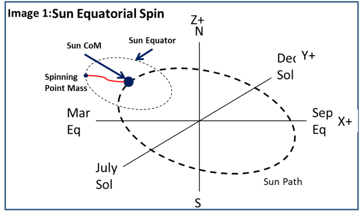 Die Bewegung der Sonne unterscheidet sich deutlich von der Bewegung der Planeten. Die Sonne folgt einer unregelmäßigen Bahn und erreicht dabei eine zweifache Schwankungsbreite ihrer Umlaufgeschwindigkeit. Das Plasma der Sonne hat die Fähigkeit, sich unter der Zentrifugalbeschleunigung durch die axiale Drehung abzuflachen. Diese Fähigkeit teilen auch die Gasriesen Jupiter und Saturn, die sich mit einer noch höheren Äquatorialgeschwindigkeit als die Sonne drehen.