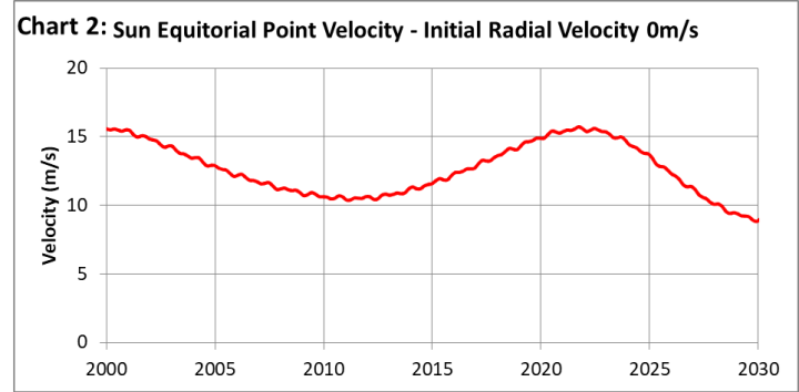 Der EP behält im Wesentlichen seine Position in X-Richtung bei und beschreibt eine ähnliche, aber verschobene Umlaufbahn. Graphik 2 zeigt die Geschwindigkeit des EP, wenn die Sonne keine Rotation hätte. Sie entspricht der Geschwindigkeit der Sonne. Venus trägt am meisten zu den kleinen Schwankungen in der Geschwindigkeit bei.