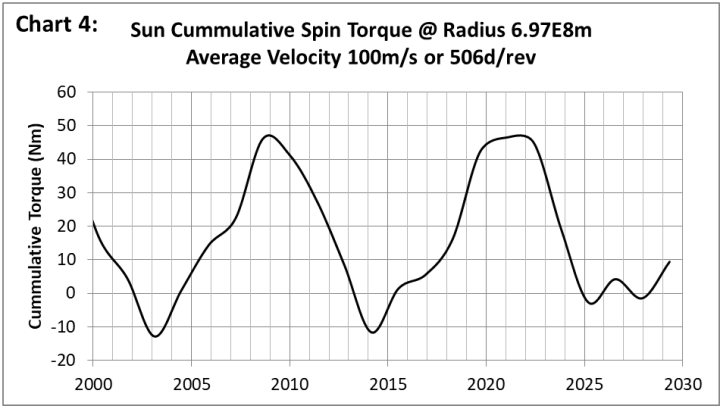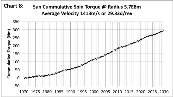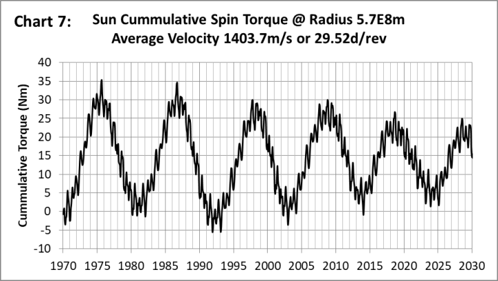 Das kumulative Drehmoment durchläuft eine Phasenfolge, wenn sich die Anfangsgeschwindigkeit der Resonanz nähert. Graphik 7 zeigt das kumulative Drehmoment bei 5,7E8 m für 1403,7 m/s, das ausgewählt wurde, weil die Zyklen eine gute negative Korrelation mit der Sonnenaktivität über einen Zeitraum von 60 Jahren aufweisen.
