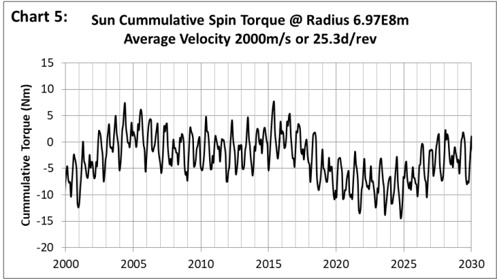 Die äquatoriale Rotation der Sonne beträgt etwa 25 Tage, was einer Geschwindigkeit von 2000 m/s entspricht. Graphik 5 zeigt das kumulative Drehmoment auf den EP unter diesen Bedingungen.