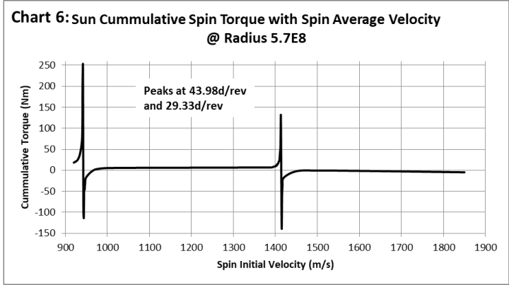 Falls die Drehung der Sonne durch Gravitationseffekte verursacht würde, wären diese in dem Bereich am stärksten ausgeprägt, der das höchste Drehmoment erzeugen könnte. Betrachtet man die Sonne als eine Reihe konzentrischer Zylinder, welche die Rotationsachse umgeben, und geht man von einer konstanten Dichte aus, würde das höchste Drehmoment bei 5,7E8 m erreicht werden, was einer Breite von 35 Grad entspricht. Dementsprechend zeigt Graphik 6 das kumulative Drehmoment für einen Bereich von Anfangsrotationsgeschwindigkeiten bei 5,7E8 m von 900 m/s bis zu 1850 m/s.