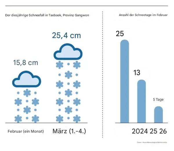 Allein am Dienstag fielen in Taebaek 25,4 cm Schnee, weit mehr als die 15,8 cm, die im gesamten Februar gefallen waren. Bis zum 6. März wird weiterer Schneefall erwartet.