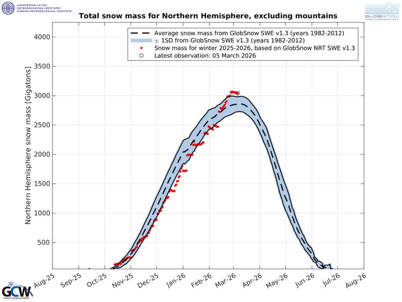 Mit einer Gesamtmenge von fast 3.100 Gigatonnen liegt die Masse laut GlobSnow-Daten derzeit etwa 300 Gigatonnen über dem Normalwert.