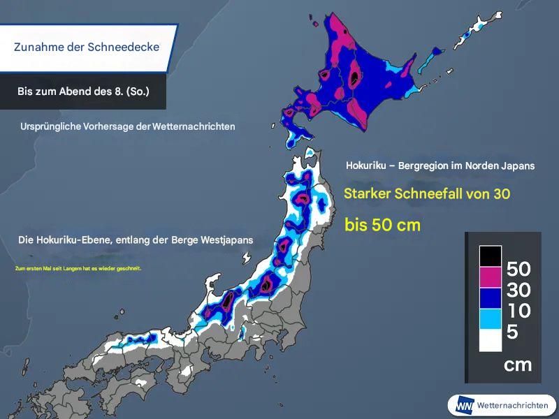 Prognosen zeigen, dass sich am 7. und 8. März ein weiteres Tiefdruckgebiet über Nordjapan bildet und frische Kaltluft nach Süden zieht. Meteorologen warnen, dass es an der Ostküste von Hokkaido am Wochenende zu starken Schneefällen kommen dürfte und auch die Hokuriku-Ebene mit der Ankunft der kälteren Luft erneut von Schneefällen heimgesucht werden könnte: