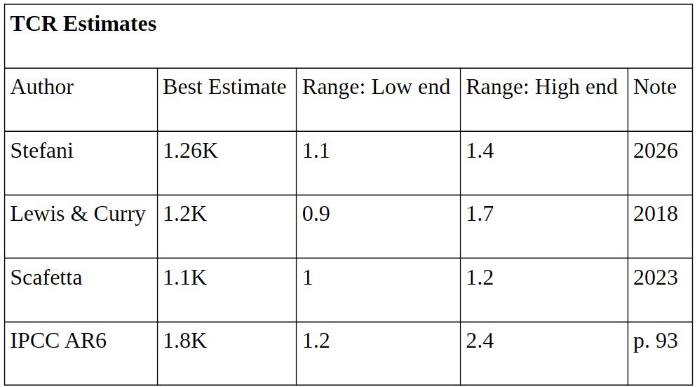 Tabelle 1. Schätzungen des TCR oder der vorübergehenden Klimareaktion auf eine Verdopplung des CO₂. Quellen: (Stefani, 2026), (Lewis & Curry, 2018), (Scafetta, 2023) und (IPCC, 2021, S. 93).