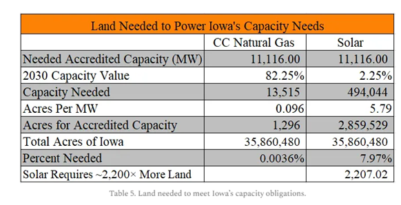 Nach dem Bewertungssystem von MISO wären „im Planungsjahr 2025–2026 für einen MW akkreditierter Kapazität 19,29 Acres Solarmodule erforderlich, verglichen mit 0,14 Acres für ein Erdgas-Kombikraftwerk“, schätzen Orr und Rolling.