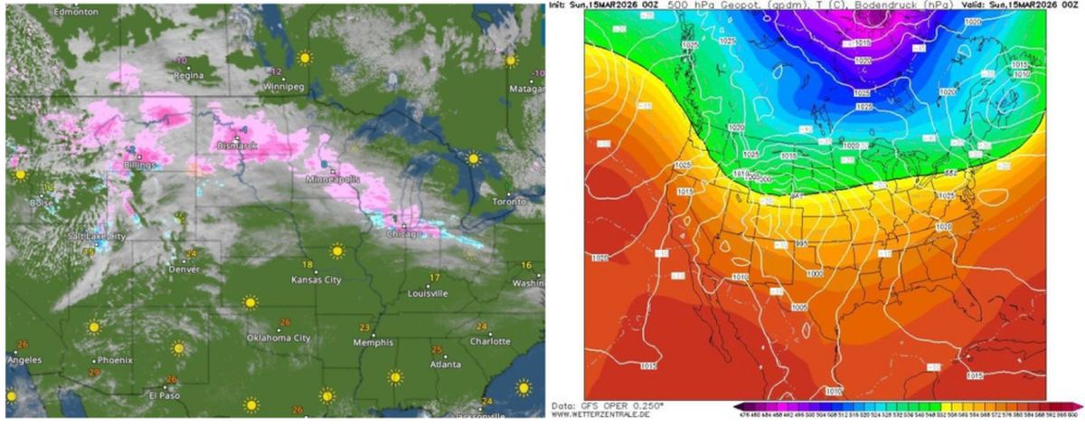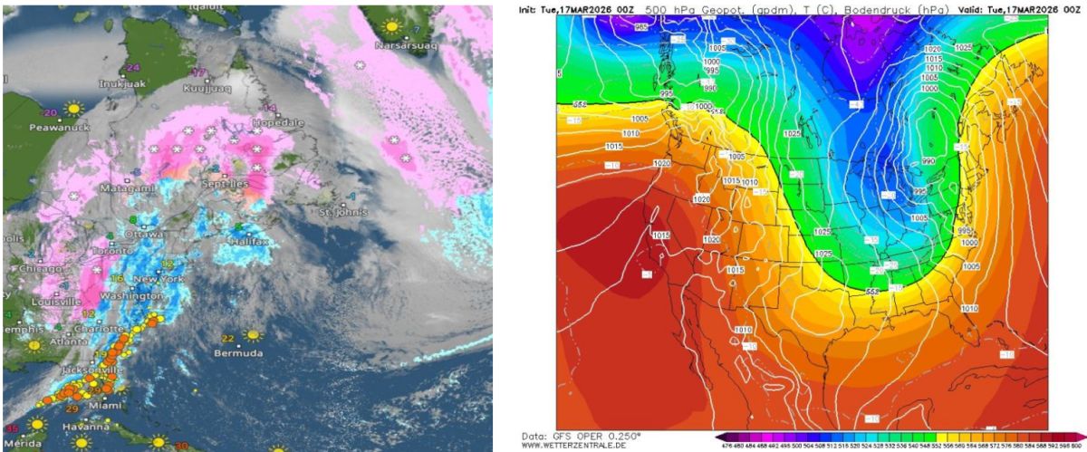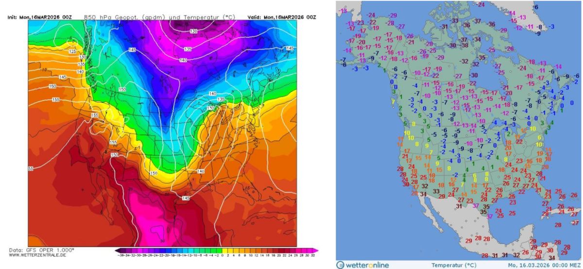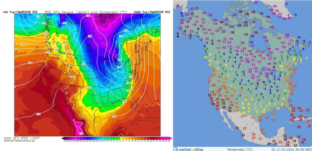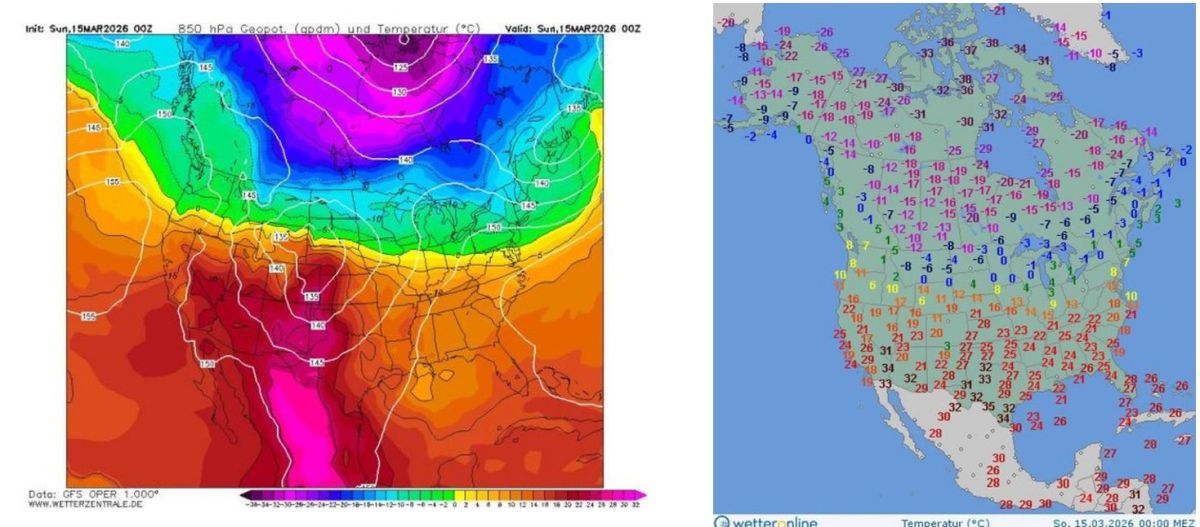 Die im Kältereport Nr. 12 / 2026 angesprochene Entwicklung der Zyklone von Mitte März in Teilen der USA ist selbst für dortige Verhältnisse extrem. In Mitteleuropa ist eine solche Entwicklung aufgrund der Topographie kaum vorstellbar. In Europa verlaufen die Gebirgszüge, hauptsächlich die Alpen, in ost-westlicher Richtung. Sie blockieren sehr wirksam den direkten Austausch zwischen sehr warmer Mittelmeerluft und der kälteren Luft über Mittel- und Nordeuropa. Luftmassen aus der jeweiligen Richtung werden modifiziert, die Warmluft zum Kälteren, die Kaltluft zum Wärmeren.