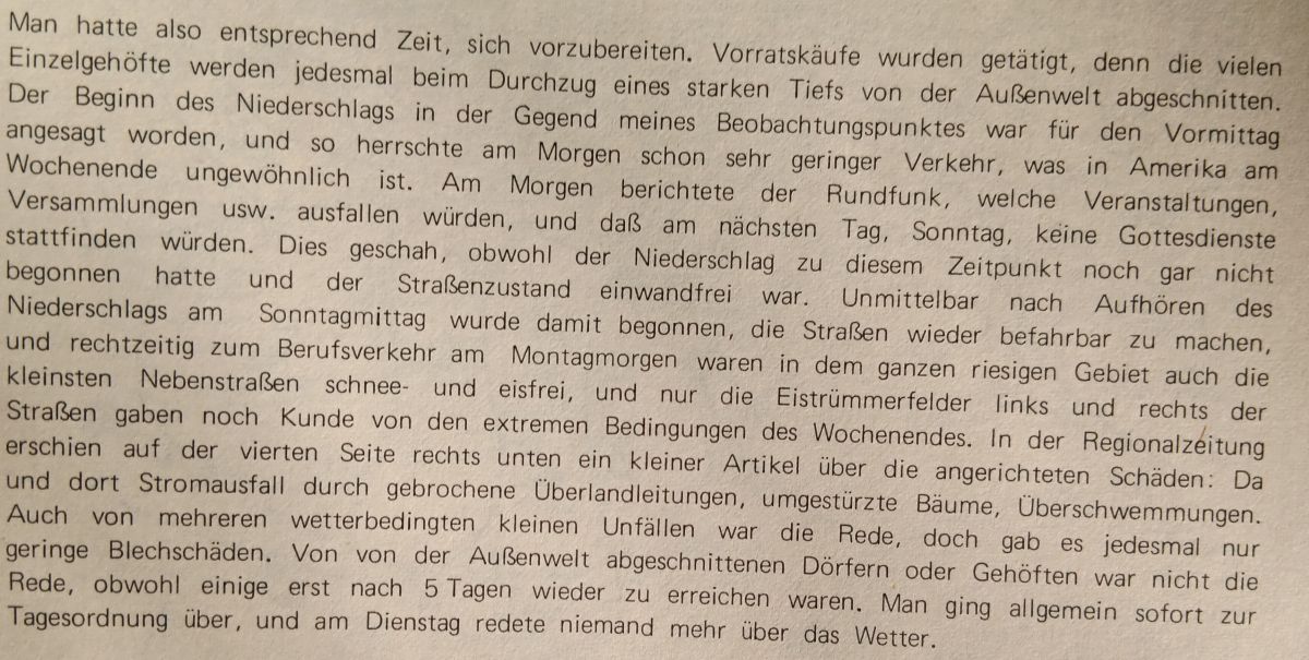 Noch ein Wort zu Reaktionen in der Bevölkerung. Derartig intensive Entwicklungen gibt es zwar nicht in jedem Jahr, aber doch immer wieder, manchmal auch mehrmals im Jahr. Der o. g. Blizzard im Jahr 1978 fiel in meine Zeit dort, und es war sehr aufschlussreich zu verfolgen, wie man in der Öffentlichkeit damit umging. Ich hatte das seinerzeit ausführlich in einer „Beilage zur Berliner Wetterkarte“ ausführlich beschrieben. Weil es damals noch keinerlei Digitalisierung gab, habe ich diese Ausführungen gescannt und zeige sie hier im Bildformat:
