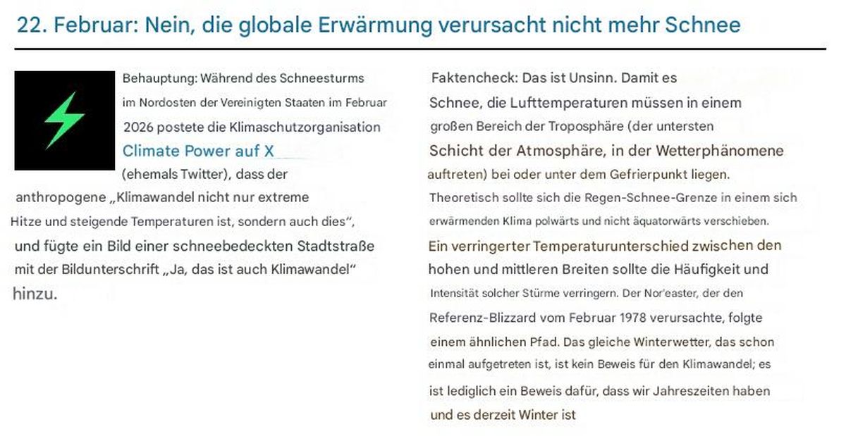 Vorbemerkung der Herausgeber: Diese Zusammenstellung dient als Faktencheck zu den häufigsten Falschbehauptungen, die im Februar 2026 in den Medien zum Thema Klimawandel aufgestellt worden sind.