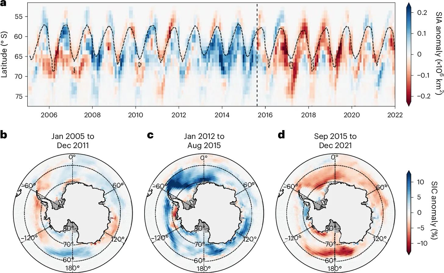 a, Zonale mittlere Anomalien der Meereisfläche im Südlichen Ozean (2005–2022). Die gestrichelte Kurve zeigt die Grenze bei 15 % Meereiskonzentration; die vertikale gestrichelte Linie markiert den Übergang von hohem zu niedrigem Meereis im August 2015. b–d, Mittlere Anomalien der Meereiskonzentration für 2005–2011 (b), 2012–August 2015 (c) und September 2015–2021 (d).