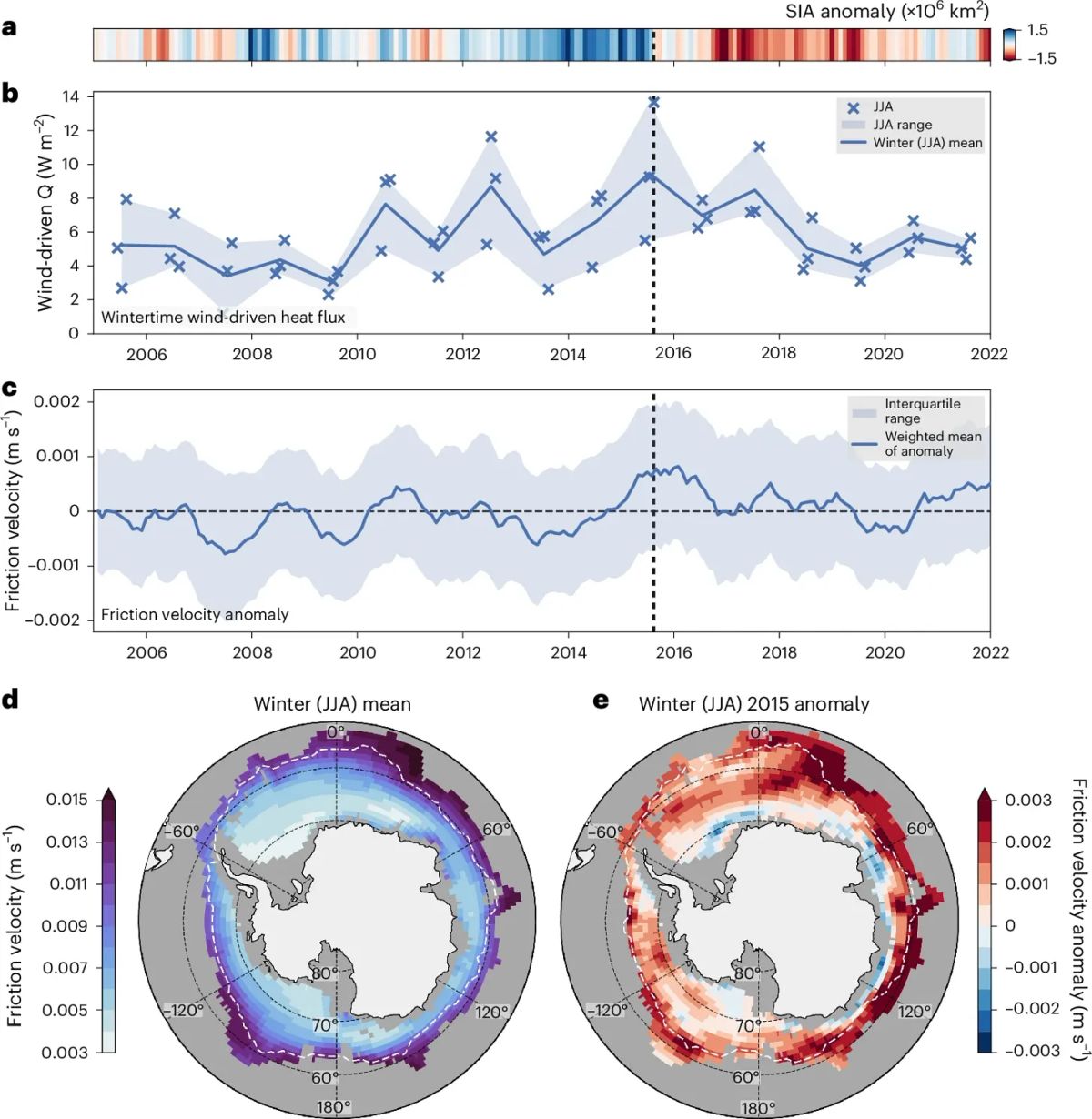 a, Monatliche Anomalie der Meereisfläche im Südlichen Ozean. b, Windgetriebener Meereswärmefluss (Q) im Winter. c, Monatliche Anomalien der Reibungsgeschwindigkeit (Windantrieb), wobei der Winterbereich schattiert ist. d, e, Typische Reibungsgeschwindigkeit im Winter (d) und die Anomalie im Winter 2015 (e). Die gestrichelte weiße Linie markiert die Grenze bei 15 % Meereiskonzentration. Die vertikale gestrichelte Linie markiert den Übergang von hohem zu niedrigem Meereis im August 2015.