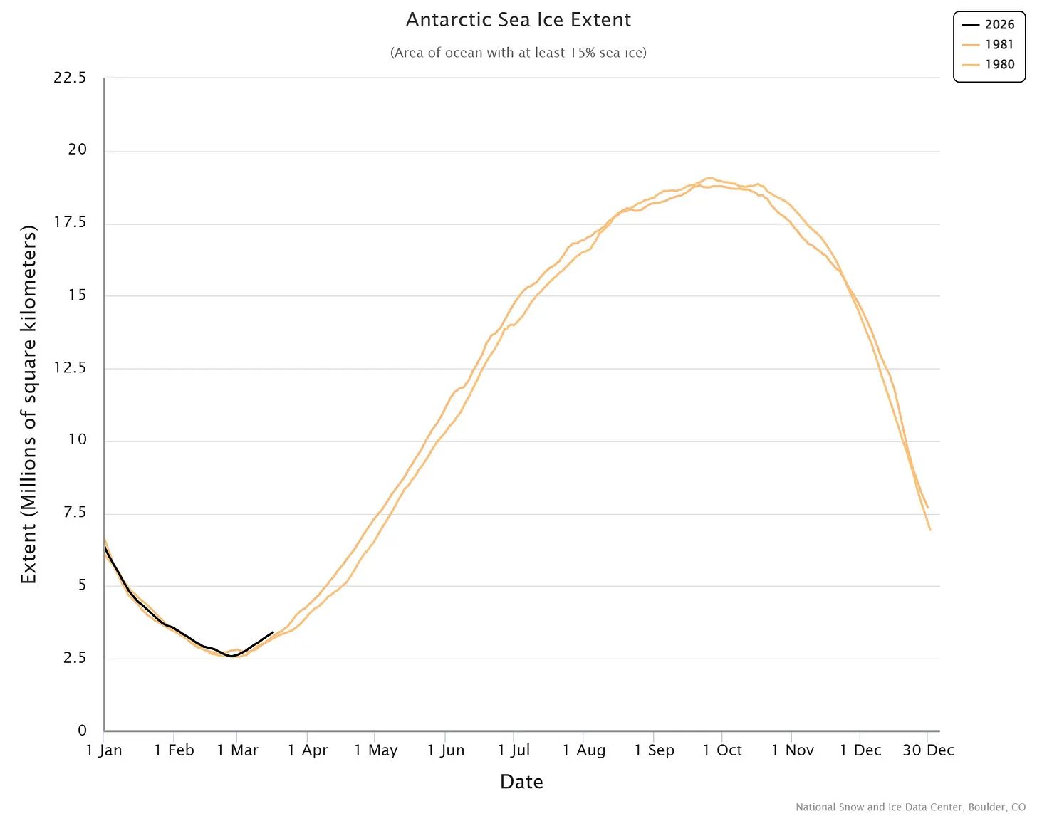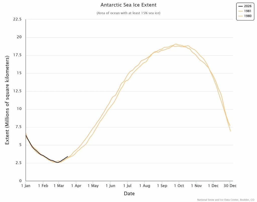Und wenn man sich die neuesten Daten ansieht, hat sich das antarktische Meereis in den letzten Monaten wieder deutlich erholt, wobei die Ausdehnung im Jahr 2026 sogar höher ist als in den frühen 1980er Jahren: