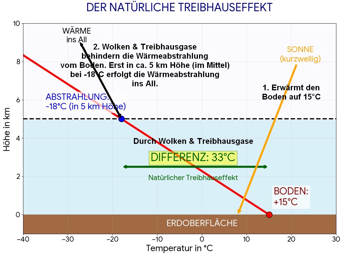 Die Sonne erwärmt den Boden auf 15°C. Dieser erwärmt die Luft, sie steigt auf, expandiert und kühlt dabei ab, im Schnitt um 6.5°C pro 1000m. Somit sind es dann in 5.1km die 33K weniger.