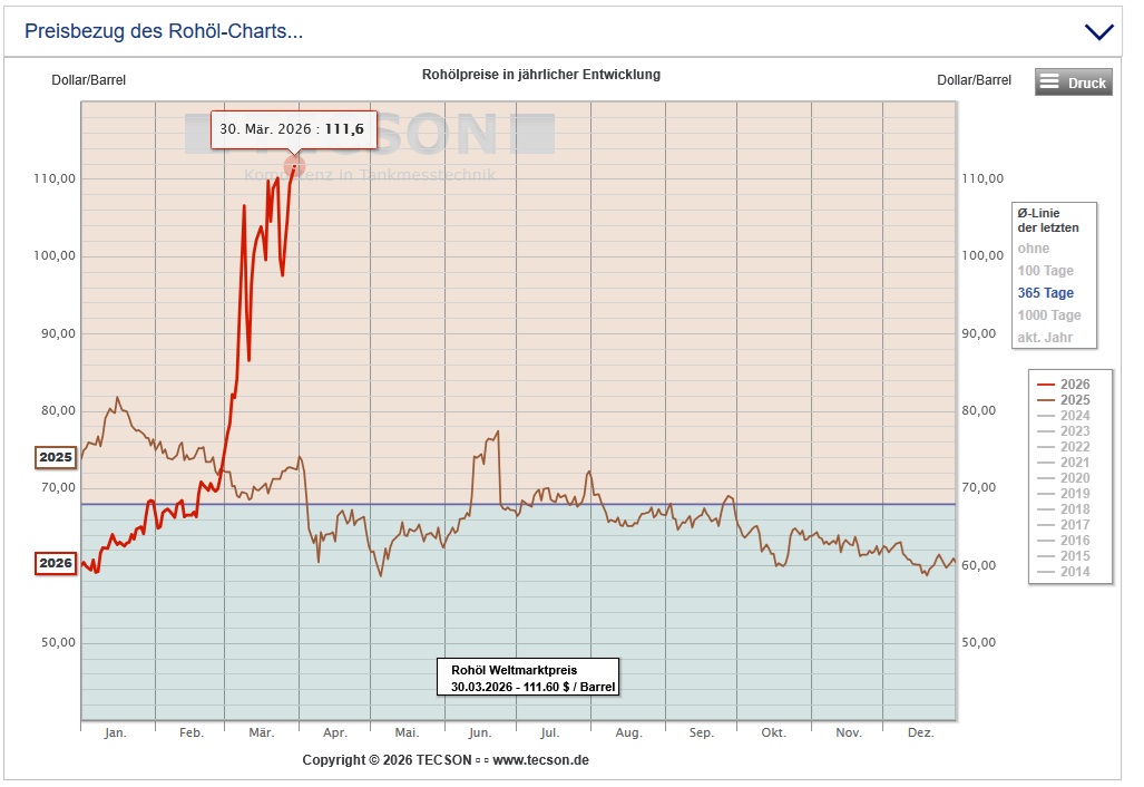 Der Erdölpreis hat sich auf über 110 US$ je Fass aufgemacht und an der Tankstelle ist der Diesel bei um die 2,30 €/Liter.