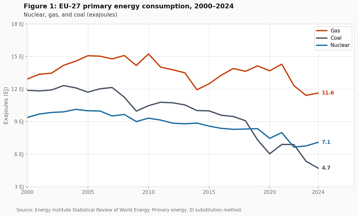 Der Gasverbrauch blieb unterdessen hoch, und der Kohleverbrauch lag – obwohl rückläufig – im Jahr 2024 immer noch knapp unter 5 EJ. Die folgende Abbildung zeigt die Verbrauchsentwicklung aller drei Energieträger in der EU-27 für dieses Jahrhundert: