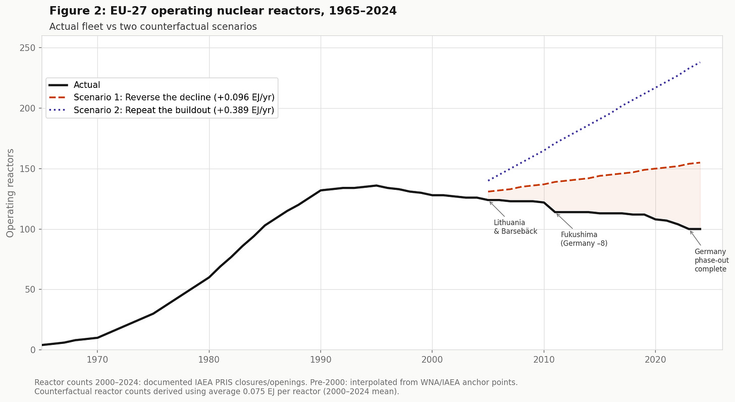 Heute werde ich diese Frage aus quantitativer Sicht beleuchten. Ich stelle zwei kontrafaktische Szenarien aus den frühen 2000er Jahren vor, als der Kernkraft-Stromverbrauch in der EU-27 seinen Höhepunkt erreichte. Im ersten kontrafaktischen Szenario gehe ich davon aus, dass Europa, anstatt seinen Kernkraftwerkspark zu verkleinern, einen Kurs des moderaten Wachstums eingeschlagen hat. Das zweite kontrafaktische Szenario geht davon aus, dass Europa zu der Rate des Kernkraftwerksausbaus (vor allem in Frankreich) von etwa 1970 bis etwa 1990 zurückgekehrt ist und jedes Jahr etwa sieben neue Reaktoren in Betrieb genommen hat.