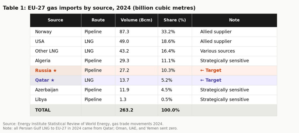 Ich ordne die zusätzliche Kernenergie-Erzeugung der kontrafaktischen Szenarien folgenden Quellen zu: (1) russischem Pipelinegas, (2) LNG aus Katar und (3) EU-Kohle. Die nachstehende Tabelle zeigt, woher die EU-Gasimporte im Jahr 2024 stammten. Meine Analyse betrachtet das Jahr 2024 lediglich als Momentaufnahme und geht vereinfachend von einer Substitution im Verhältnis 1:1 aus. 2