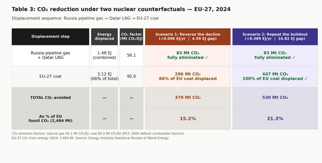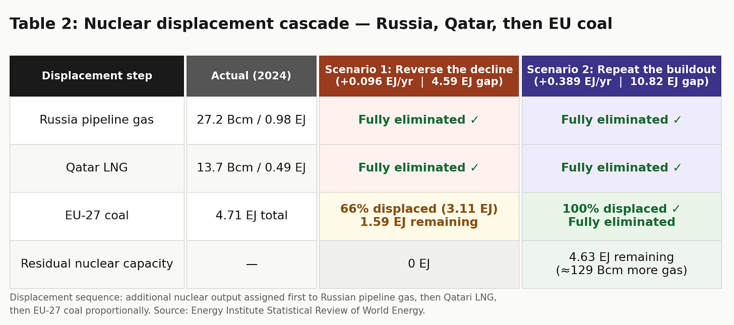 Die kontrafaktische Kernenergielücke im Szenario „Den Rückgang umkehren“ beträgt 4,6 EJ – mehr als das Dreifache der gesamten Importe aus Russland und Katar, die sich auf 1,5 EJ belaufen. Gemessen an der Energiemenge hätte die EU-27 diese Importe einsparen können.