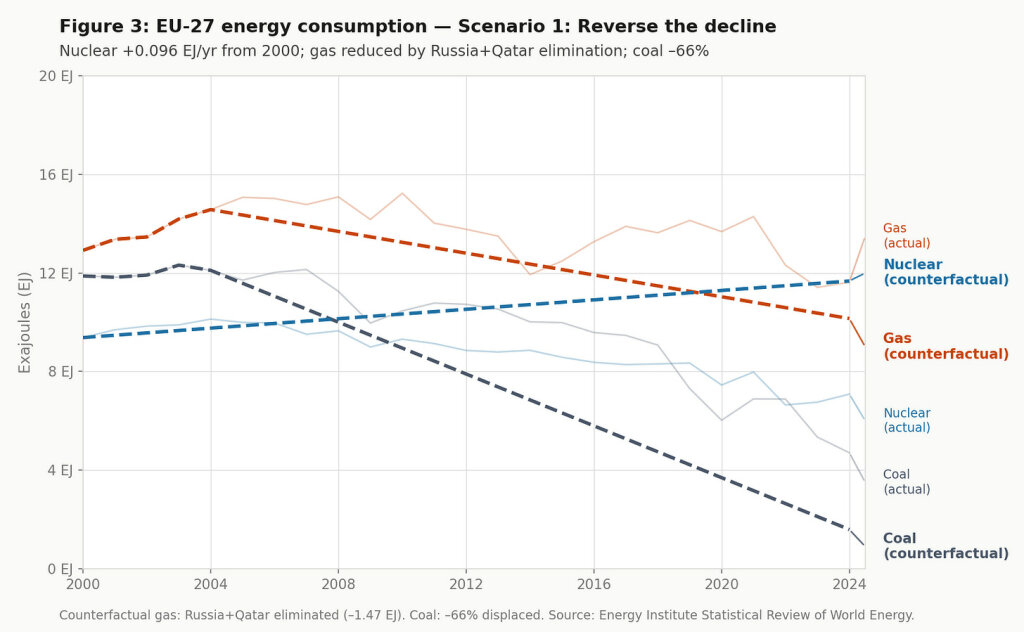 Szenario 1 – Den Rückgang umkehren. Der Kernenergieverbrauch der EU-27 ging von 2000 bis 2024 um 0,096 EJ pro Jahr zurück. Was wäre, wenn er stattdessen um den gleichen Betrag gestiegen wäre? Ausgehend von 9,4 EJ im Jahr 2000 und einer jährlichen Zunahme von 0,096 EJ hätte der Kernenergieverbrauch bis 2024 11,7 EJ erreicht – was etwa 155 in Betrieb befindlichen Reaktoren entspricht. Dieses Szenario führt zu einem Anstieg des Kernenergieverbrauchs in der EU-27 um 4,6 EJ im Vergleich zur tatsächlichen Entwicklung.