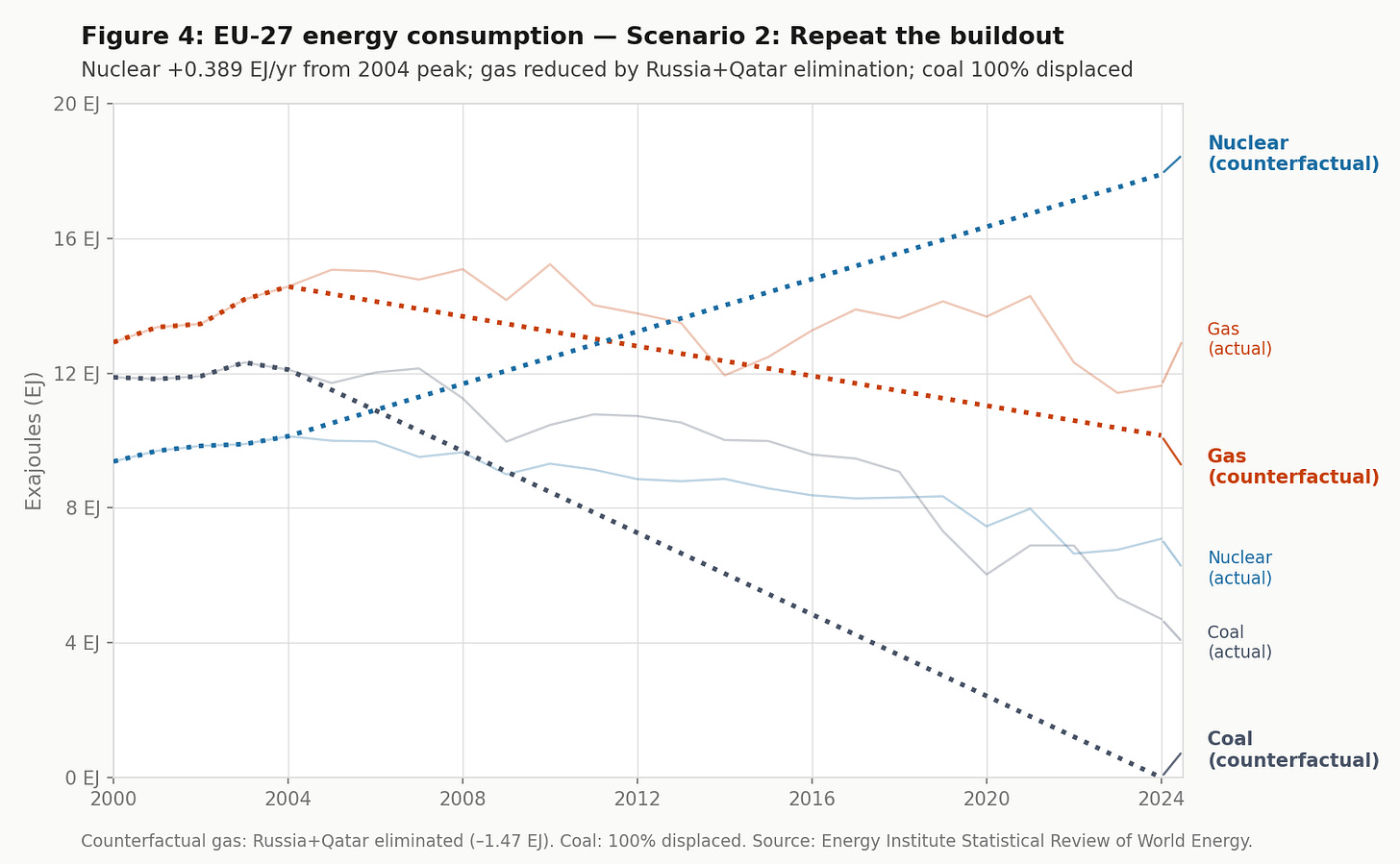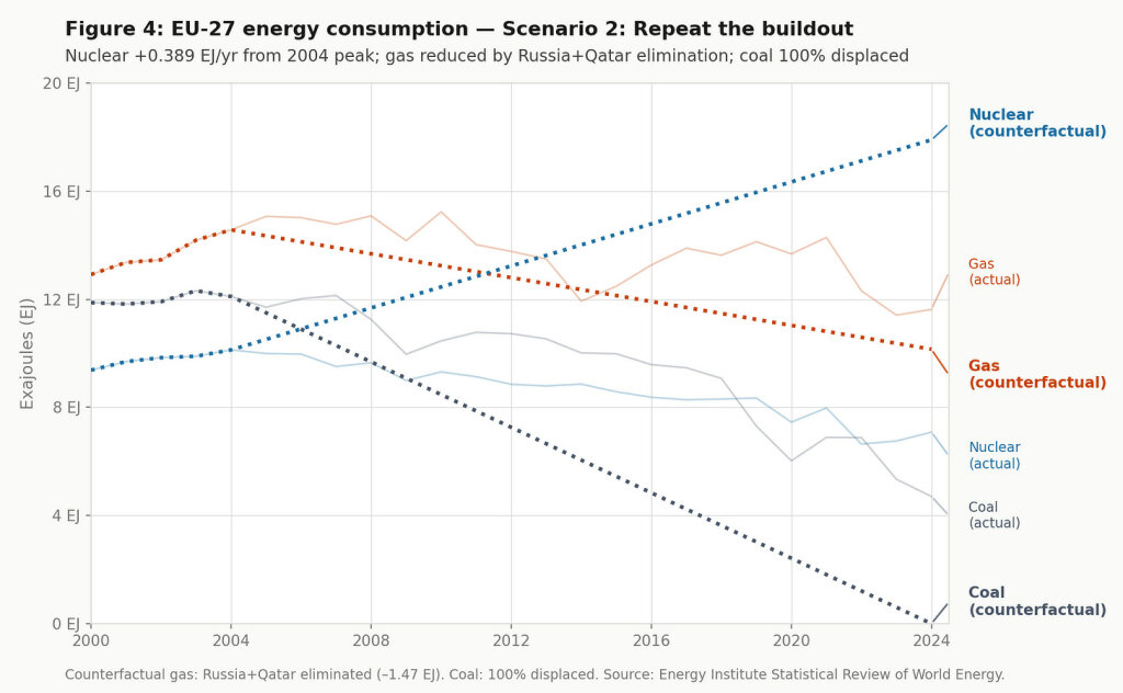 Die folgenden Abbildungen zeigen den Energieverbrauch der EU-27 in den einzelnen kontrafaktischen Szenarien. Dargestellt sind die tatsächlichen Werte für Kernenergie, Gas und Kohle bis 2024; die gestrichelten kontrafaktischen Linien weichen ab dem Höchststand von 2004 ab, was mit der oben beschriebenen Verdrängungssequenz übereinstimmt.