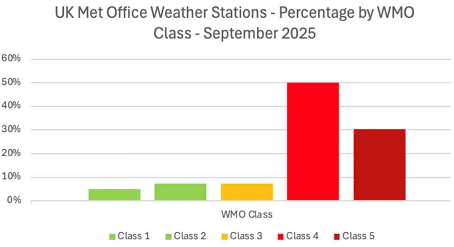 Die meisten dieser Messwerte stammen von Standorten niedrigerer Qualität (CIMO 3–5). Hochwertige Standorte der Klasse 1 machen nur einen kleinen Teil des Netzwerks des Met Office aus.