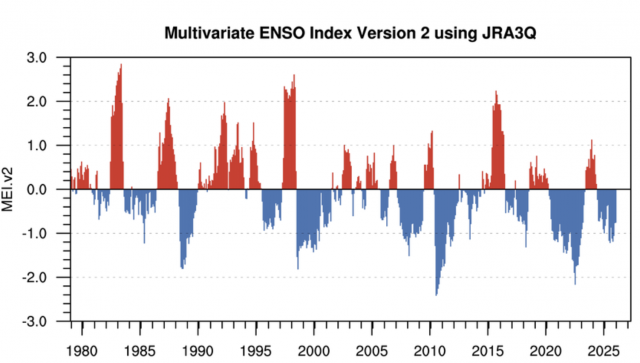 Man sieht ganz klar, dass es derzeit mehr La Niñas als El Niños gibt. Warum erwärmt sich die Erde dann? Weil die La Niñas eine Reaktion auf die Erwärmung sind. Sie sind sozusagen Pflaster auf einer Wunde, die sich aufgrund des erhöhten geothermischen Eintrags, sonnenbedingter Faktoren und der durch die verzerrte Erwärmung bedingten Wolkenlosigkeit in den Tropen erwärmt hat.