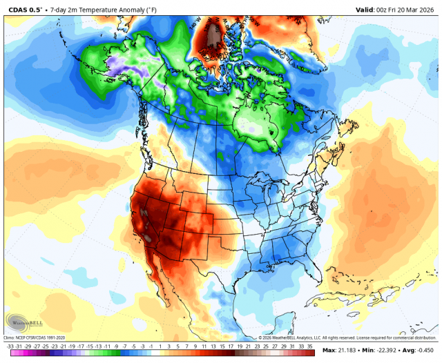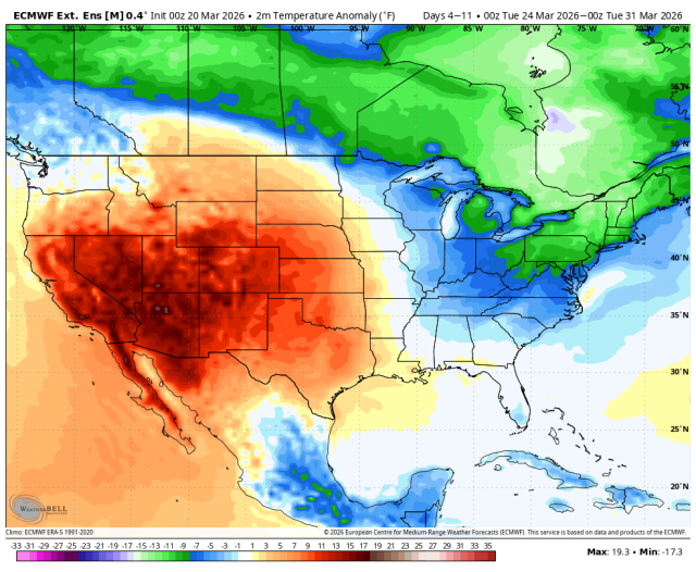 Es werden neue Rekorde für die früheste Zeit seit Beginn der Aufzeichnungen aufgestellt. Aber vergessen wir nicht, dass wir in den Vereinigten Staaten auch schon einige Rekordschwankungen von warm nach kalt erlebt haben. Ja, der März war ein turbulenter Monat. Aber der März sollte turbulent sein. Es ist die Zeit, in der der hartnäckige Winter mit aller Kraft gegen den vorrückenden Sommer kämpft. Und es ist noch nicht vorbei, denn ich erwarte im April ebenfalls turbulentes Wetter, das bis Mitte oder Ende des Monats eine völlige Umkehrung des Wetterverlaufs mit sich bringen könnte.