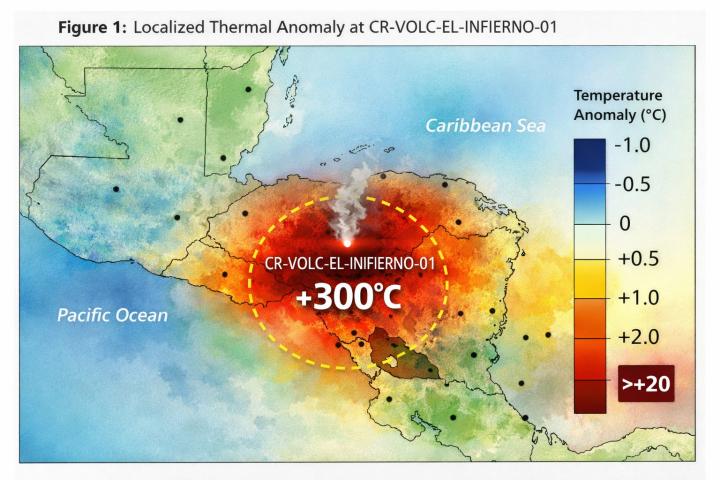 Betrachten wir ein vereinfachtes Stationsnetzwerk rund um CR-VOLC-EL-INFIERNO-01. Nehmen wir an, die anomale Station meldet eine Temperatur Tₐ ≈ 573 K (300 °C), während benachbarte Stationen typische tropische Werte Tₙ ≈ 300 K (27 °C) melden. Die Differenz ΔT ≈ 273 K führt zu einem Gradienten, der um Größenordnungen größer ist als die typische Variabilität zwischen den Stationen.