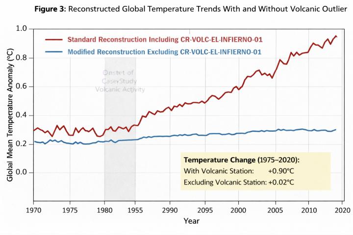 Abbildung 3. Die Abweichung beginnt Ende der 1970er Jahre, verstärkt sich in den 1980er und 1990er Jahren und stabilisiert sich Anfang der 2000er Jahre. Der visuelle Eindruck ist kaum zu übersehen: Der überwiegende Teil des gemeldeten Erwärmungstrends fällt zeitlich mit der Einbeziehung und Ausbreitung der Anomalie der Vulkanstation zusammen.