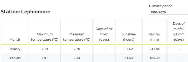 Genau das wird in der öffentlich zugänglichen Datenbank des Met Office mit den „standortspezifischen Langzeitdurchschnittswerten“ für Lephinmore behauptet. Es stehen zwei Optionen zur Verfügung, um die 30-jährigen monatlichen Durchschnittswerte von 1961–1990 und 1991–2020 zu verfolgen. Wie bereits erwähnt, ist es wahrlich ein Wunder der modernen Meteorologie, dass man aus so großer Entfernung Durchschnittswerte für Höchst- und Tiefsttemperaturen auf ein Hundertstel Grad Celsius genau berechnen kann. Und lokale Niederschlagsmengen auf zwei Dezimalstellen genau. Was für eine Präzision!