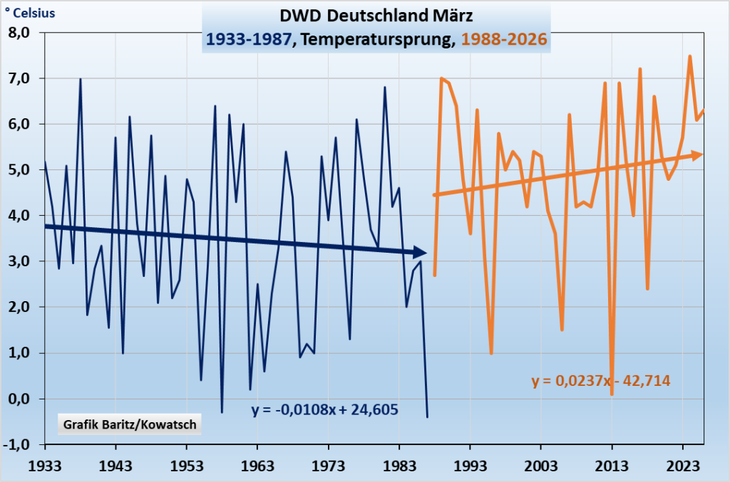 Im Teil 1 betrachteten wir den Zeitraum ab 1893 bis heute, also 134 Jahre März einst im Kaiserreich bis heute und unterteilten die Märzgrafik in 2 Abschnitte, vor 1988 und danach. Aus zwei Gründen: Zum einen trat der selbst ernannte Weltklimarat mit seinen CO₂-Erwärmungsverheißungen zum ersten Male 1988 an die Öffentlichkeit, außerdem erfolgte in Mitteleuropa um 1987/88 ein plötzlicher Temperatursprung auf ein höheres Temperaturniveau, auf dem wir uns noch heute befinden. Hier nochmals der Temperatur-Verlauf laut DWD.