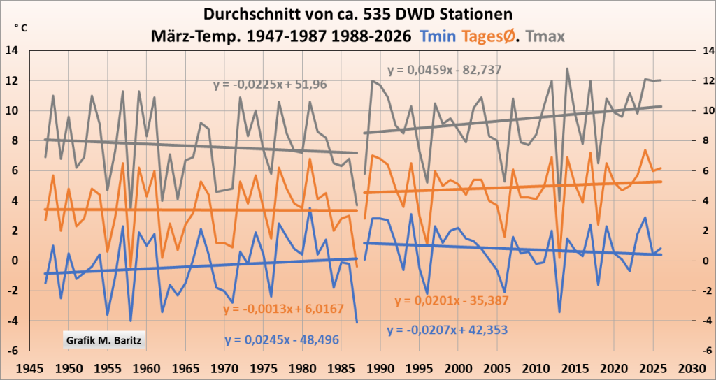 Abb. 3: Aufgetragen sind 2 Zeiträume, 1947 bis 1987, dann der Temperatursprung und ab 1988 bis heute. Außerdem 3 Grafikverläufe: Die obere graue Grafik fasst die tagsüber gemessenen mittleren Tmax Temperaturen des Monats März zusammen, die mittlere braune Grafik die Tagesschnitte und die blaue Grafik die Nachttemperaturen, gemessen in Tmin. Quelle