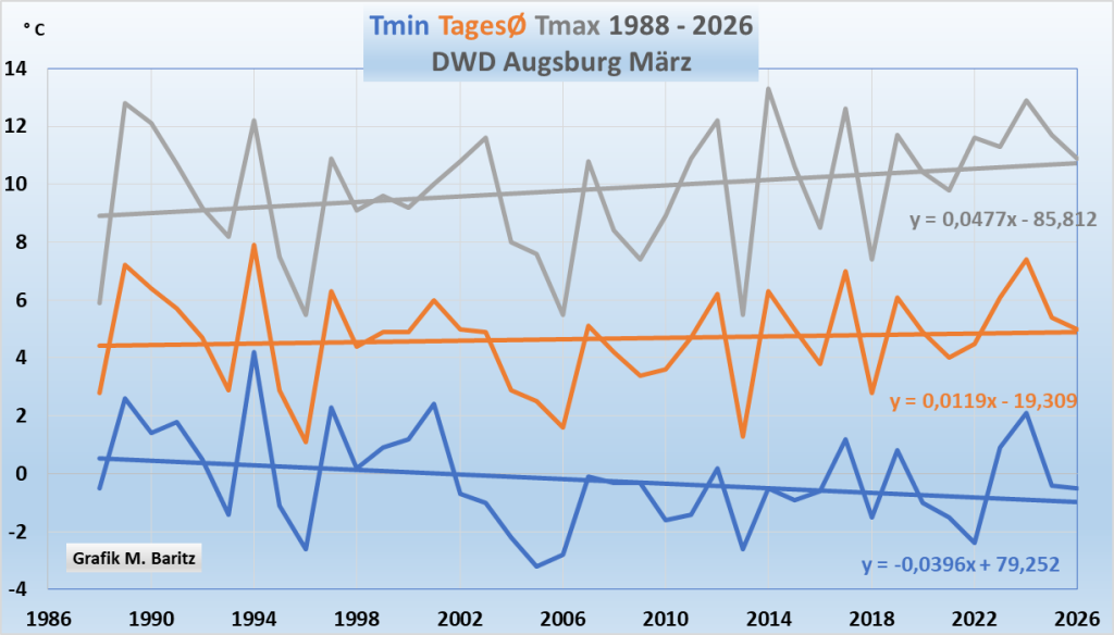 Der vollkommen unterschiedliche Verlauf der Märztage tagsüber und nachts zeigt sich bei bestimmten DWD-Wetterstationen noch viel deutlicher. Z.B. Augsburg: