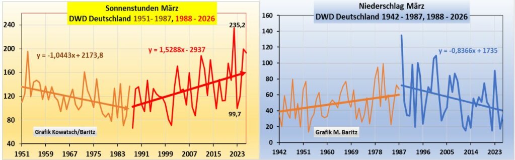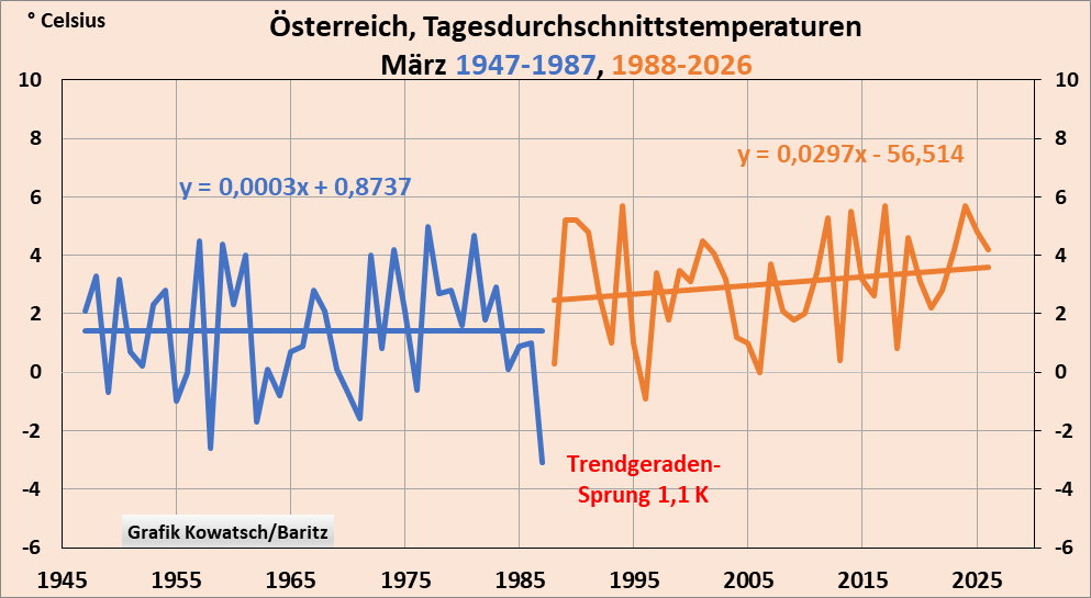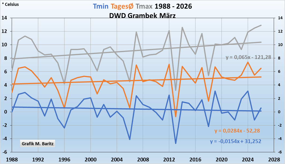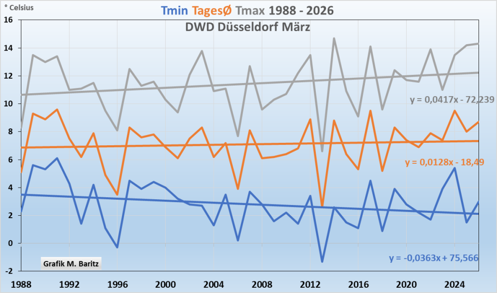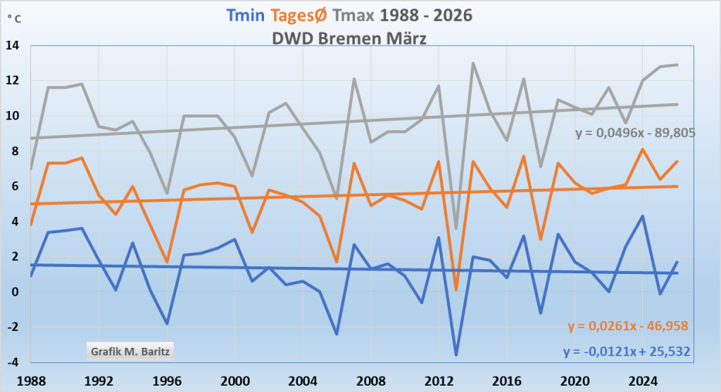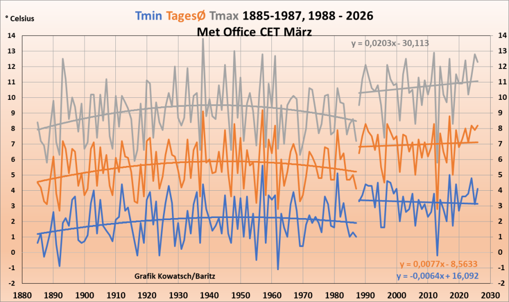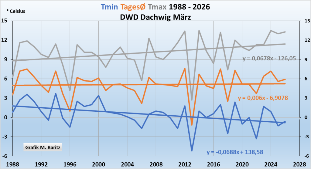 Abb. 4a: Der März wurde tagsüber wurde deutlich wärmer, die Nächte genauso deutlich kälter. CO₂ kann doch tagsüber nicht anders wirken als nachts. Die wirklichen Gründe, siehe später