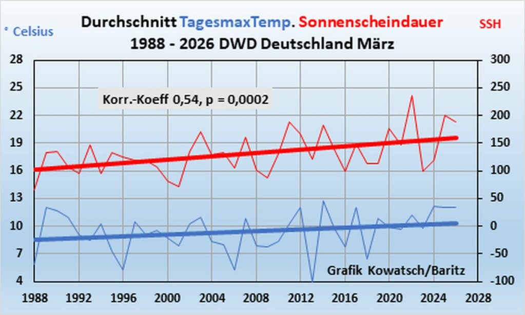 Ein möglicher weiterer Grund für die Märzerwärmung tagsüber zu den bisher genannten soll hier nur zur Information gestellt werden: das Geo-Engineering. Der Schweizer Dipl. Physiker Dr. rer. nat. Philipp Zeller beschäftigt sich schon 30 Jahre mit den Methoden des Geoengineerings. In diesem Vortrag (45-Minuten) stellt er einige vor, die alle Anwendung finden: https://youtu.be/3NHzBFchZwc?si=DVG2oBzwmqge0c3G