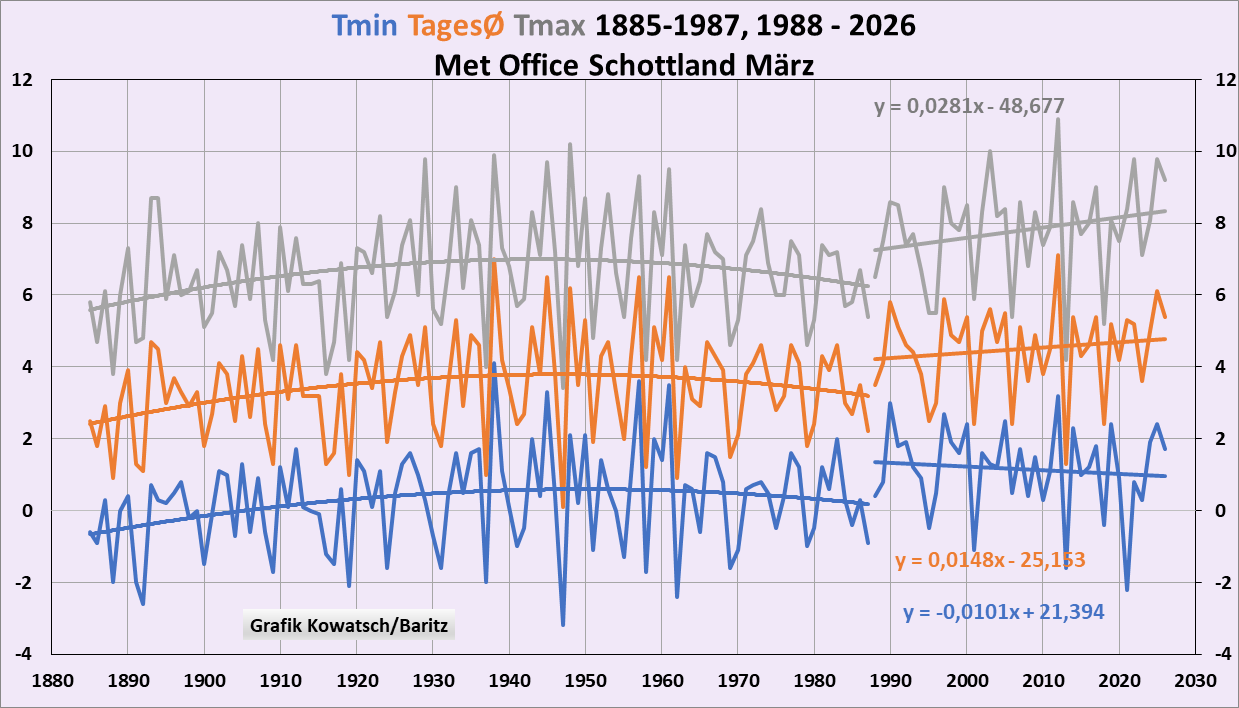 Abb. 7b: Interessant ist eine Betrachtung einer längeren Temperaturreihen hier am Beispiel Schottland (CET sieht genauso aus). Nach fast genau 100 Jahren parallel laufender Temperatur-Trendlinien zeigt sich ab 1987 ein Temperatursprung mit deutlicher gegenläufigen Temperatur-Trendlinien.