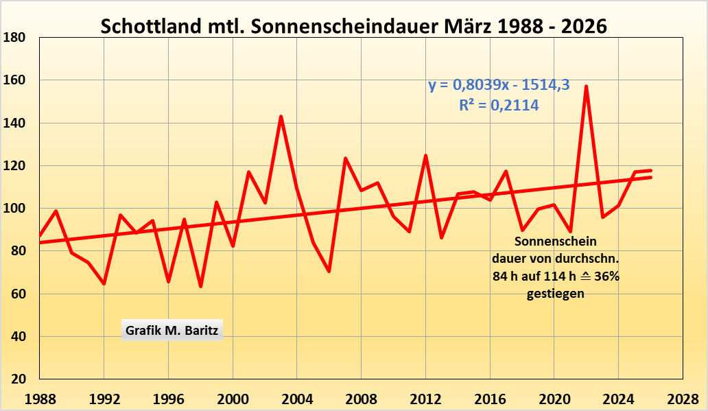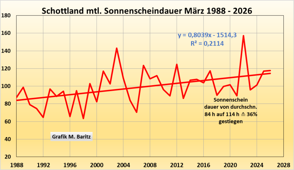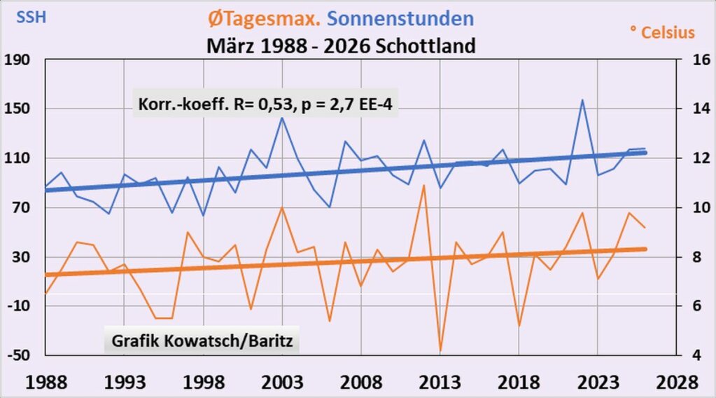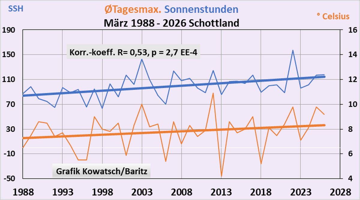 Obwohl Schottland viel nördlicher liegt als Deutschland ist auch dort der Zusammenhang zwischen Sonnenstunden und T-Max tagsüber deutlichst, siehe nächste Grafik: