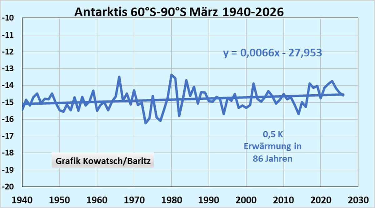 Abb.10a: Kaum Märzerwärmung über die gesamte Antarktis seit 85 Jahren beim Monat März. (Erster Herbstmonat), Allerdings ist die Erhebung nicht vollkommen zuverlässig, erst seit gut 30 Jahren wächst die Genauigkeit an Überwachung. Deshalb soll die deutsche Einzelstation Neumayer seit 1982 zur Genauigkeit verhelfen. Die Wetterhütte befindet sich deutlich entfernt von der Großstation, so dass keinerlei Stationswärme die Messung beeinflusst.