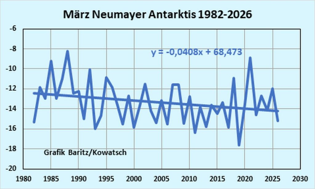 Abb. 10b: Keine Märzerwärmung, im Gegenteil. Neumayer kühlt die letzten 44 Jahre deutlich ab. Wo bleibt die Wirkung des angeblich erwärmenden CO₂? Siehe deutlich fallende Trendlinie. Quelle