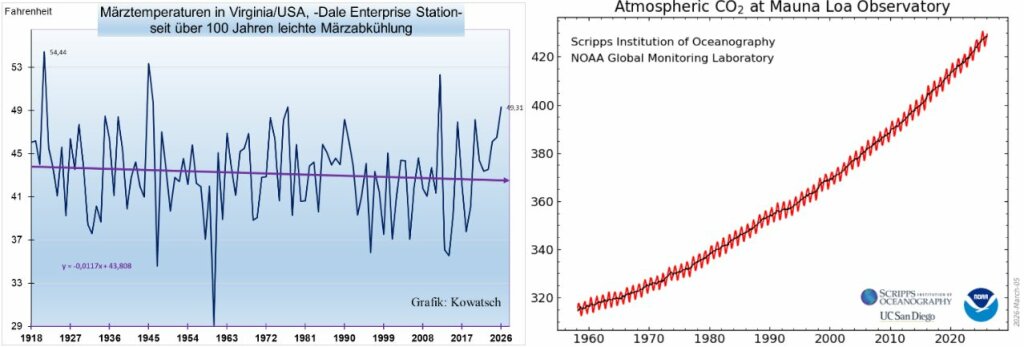 Abb. 11a/b: Keinerlei Märzerwärmung seit über 100 Jahren in Virginia bei dieser ländlichen Station in den USA, obwohl die CO₂-Konzentrationen wie überall laut Treibhauskirche von etwa 280 ppm seit 1880 auf nunmehr 428 ppm gestiegen sind. Allerdings lagen die letzten 7 Märzen über der fallenden Trendlinie. Der am Mouna Loa gemessene weltweite CO₂-Anstieg seit 1958 hat einen ganz anderen Verlauf.