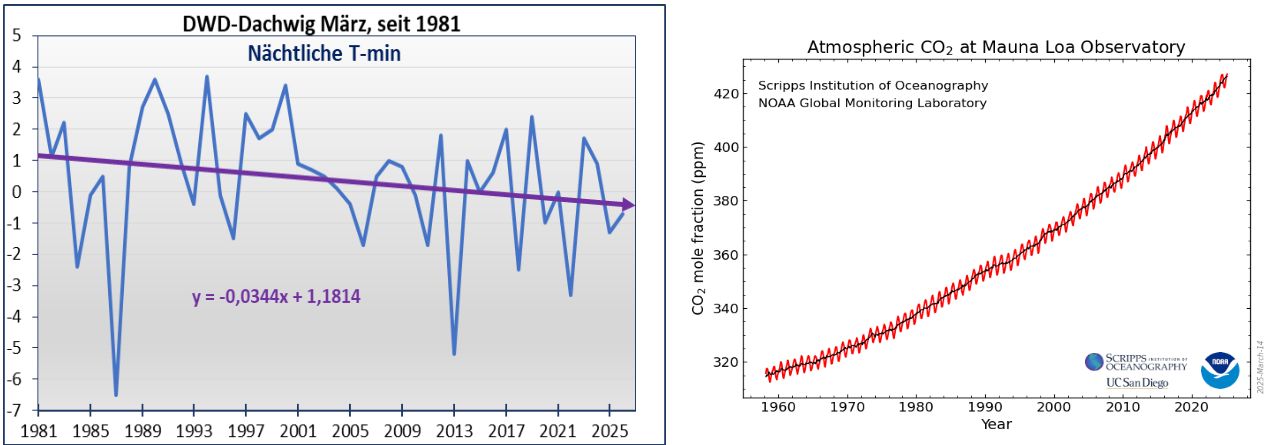Abb. 4f: Seit 45 Jahren, seit Bestehen der ländlichen Station wird der März in Dachwig nächtens deutlich kälter, ganz im Gegensatz zur CO₂-Zunahmekurve (rechts). Ab 1988 bis heute wäre die negative Steigung bei Dachwig sogar: y = – 0,07 x, geradezu ein nächtlicher Temperatursturz.