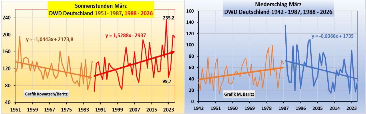 Abb. 5a/b: Die Sonnenstunden und Niederschlag sind gegenläufig. Kein Wunder, sie sind über den Grad der Bewölkung gekoppelt.
