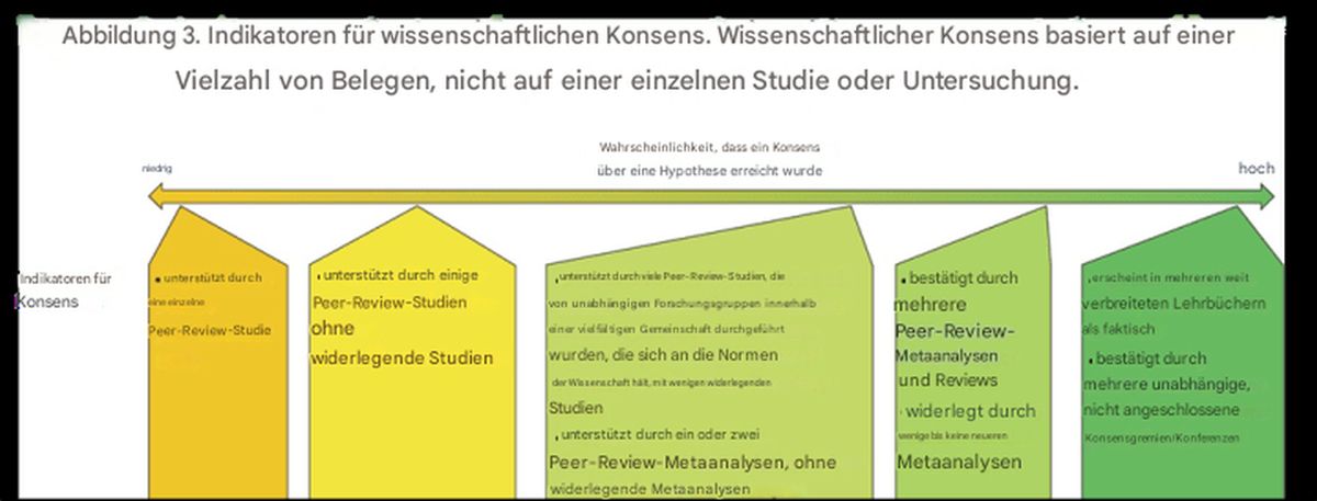 Das neue Kapitel hebt wiederholt den „wissenschaftlichen Konsens“ und die „breite Akzeptanz“ als bestimmendes Merkmal wissenschaftlicher Validität hervor. In einem Abschnitt mit dem Titel „Erreichen eines wissenschaftlichen Konsens’“ wird „Abbildung 3. Indikatoren für wissenschaftlichen Konsens“ vorgestellt, ein Spektrum von „niedrig“ bis „hoch“ der „Wahrscheinlichkeit, dass ein Konsens über eine Hypothese erreicht wurde“. Ebenda, S. 97.