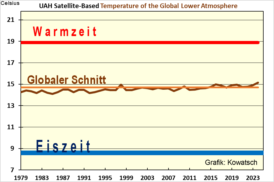 Grafik 5: Die momentan global ermittelten Temperaturen sind weit entfernt von einem Hitzetod der Erde. Die „letzte Generation“ und viele Deutsche Gutgläubige sind auch ein Opfer übertriebener und entstellter Grafiken. Das Geschäftsmodell Treibhaus betreibt nebst vielen anderen Klimalügen und Katastrophenübertreibungen auch eine ausgewählte „Grafikpanik“