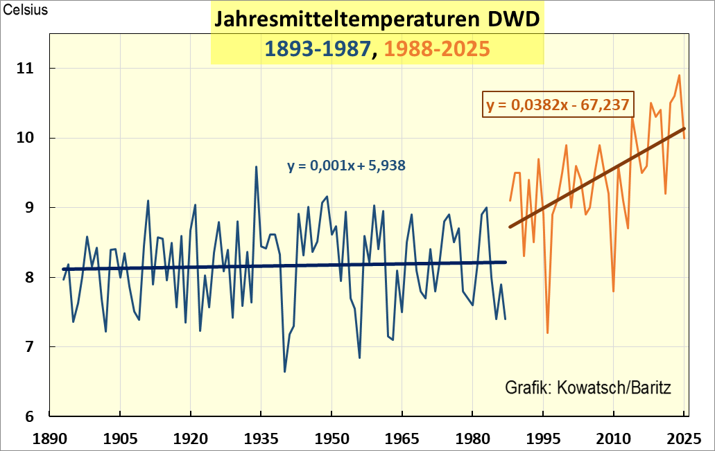 Die angenehme Erwärmung seit 1987/88 bis heute in Mitteleuropa ist ein Glücksfall für Deutschland und seine Menschen. Dass zugleich auch das Lebens- und Schöpfungsgas Kohlendioxid seit 100 Jahren weltweit zunimmt ist ein weiterer segensreicher Umstand, der die Ernten ständig steigen ließ. Die Zeit des Hungerns ist seit gut 70 Jahren vorbei. Dank der CO₂-Zunahme.