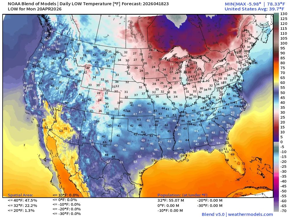 Im Zentrum der USA hat es hinter einer Kaltfront stark abgekühlt, mit erheblichen Temperaturstürzen innerhalb von 24 Stunden. Etwa ein Drittel der 48 kontinentalen US-Bundesstaaten (rund 55 Millionen Menschen) lag am frühen Montag deutlich unter dem Gefrierpunkt, wobei für Dienstag ähnliche Bedingungen erwartet werden.