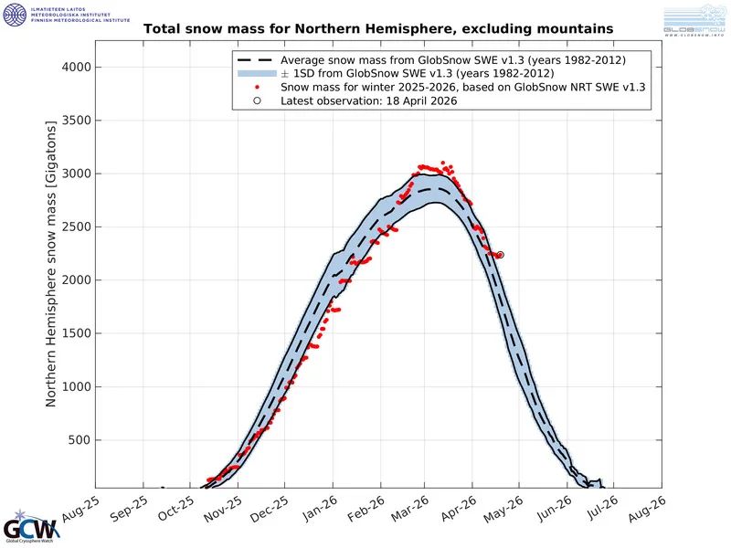 Die Schneemasse der nördlichen Hemisphäre liegt derzeit bei beeindruckenden 450 Gigatonnen über dem Durchschnitt der Jahre 1982–2012 (basierend auf den neuesten Daten vom 20. April):