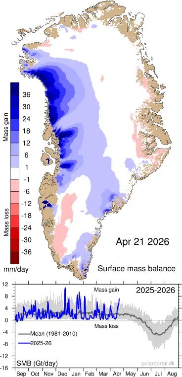 Die tägliche Oberflächen-Massenbilanz lag in den letzten Tagen deutlich über dem Durchschnitt der Jahre 1981–2010, wobei allein am 21. April rund 7 Gigatonnen verzeichnet worden waren: