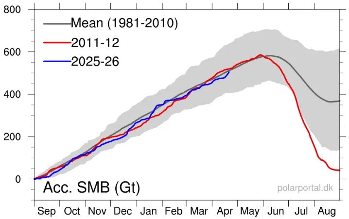 Grönland nimmt bis Ende April weiterhin an Masse zu.